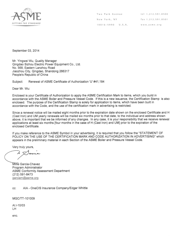 2014年7月17日至18日,?ASME審核組對我公司進行為期兩天的換證審核工作。ASME審核通過對我公司以往ASME產品的資料的審查;對設計、焊接、探傷、原材料檢驗、現場示范產品的演示、倉庫及標識移植等各個環(huán)節(jié)相關人員的審核,作業(yè)程序抽查和現場抽樣的審核,ASME審核組對我們公司的ASME體系運行給予高度評價,認為我公司完全具備設計和制造ASME規(guī)范要求的產品的能力,此次換證審核順利通過。 |
